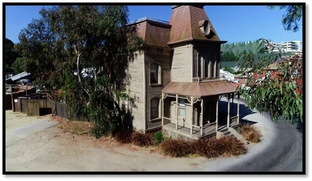 The “Psycho house” was built from a number of Universal’s stock units to save money. Originally, it consisted of just the left wall and the front of the house, but in 1963 to accommodate the house’s use in the TV series Wagon Train, the other side wall was added. In 1983, it was called out of retirement for filming of Psycho II, and the rear of the house was added. The house has been moved three times since it was originally built and came to rest where it currently sits in 1986, fittingly in a position beside the Old Falls Lake, where the swamp scenes were filmed for Psycho, and where Janet Leigh’s car was sunk.