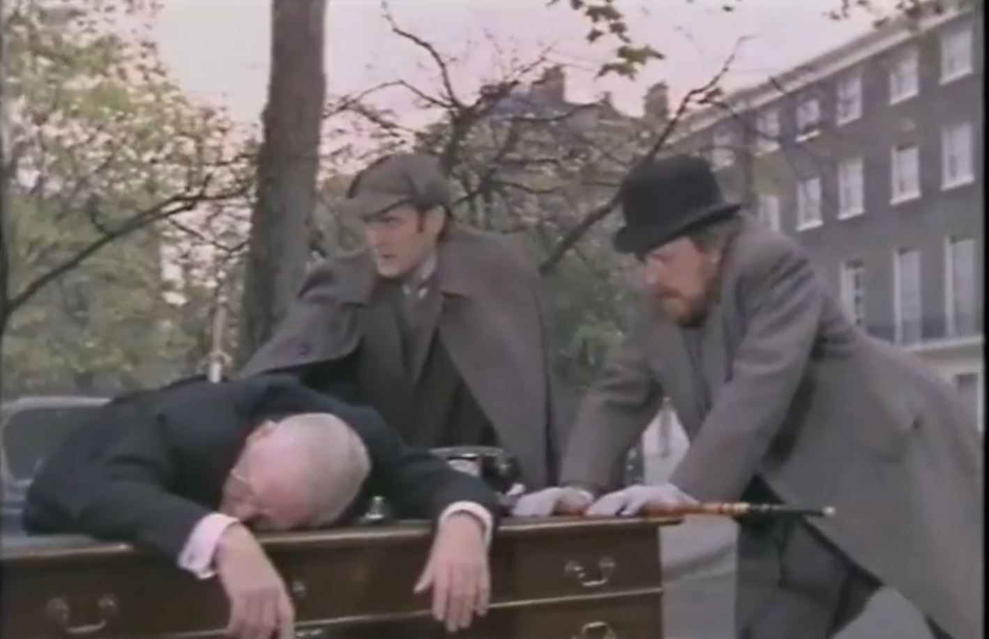 But en route, Holmes and Watson are pulled into the case of the dead solicitors. While they are pushing a desk with a dead solicitor from London to Manchester to the studios of the tv game show, Call My Bluff, (the actual cast appears and lampoons their own show) Fu Manchu gets into the act.