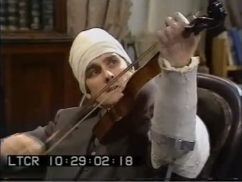 In a full-leg cast, arm in a cast, and head wrapped from the fall, Holmes and Watson confront Frank Potter, a reformed piano tuner who is actually Moriarty in Elizabethan drag. There’s something about piano tuning, which is the offense that put Potter in jail. Piano tuning is a crime? They convince Potter/Moriarty to come with them to help tune a piano. I don’t get it.Of course, you can tuna piano, but you can’t tuna fish (little classic rock joke for you).